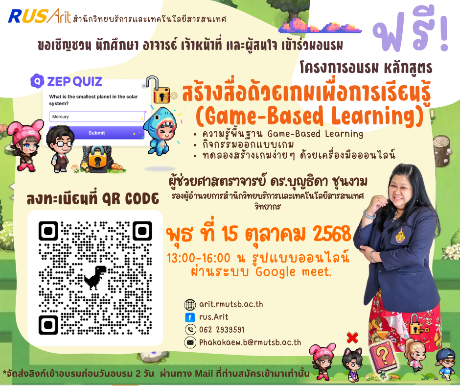 ขอเชิญชวน นักศึกษา อาจารย์ เจ้าหน้าที่ และผู้สนใจ เข้าร่วมอบรม โครงการอบรม หลักสูตรสร้างสื่อด้วยเกมเพื่อการเรียนรู้ (Game-Based Learning) | 65 ครั้ง เมื่อ 10 ชั่วโมงที่แล้ว
